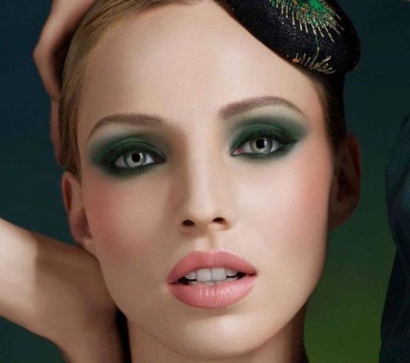 La intención es crear una mirada intensa y cautivadora. Para ello debes usar suficiente máscara de pestañas y delinear sutilmente, con un lápiz negro, al ras de estas, luego aplicar una sombra verde que incluya un pigmento de brillo dorado. Delinea las pestañas inferiores también con verde para enfatizar la mirada.