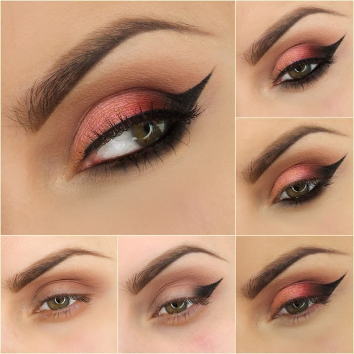 Comienza por formar un delineado al estilo cat-eye, después agrega una sombra color marrón y por último una sombra en gel color rosa intenso. Complementa agregando un delineado negro para resaltar aún más tus ojos.