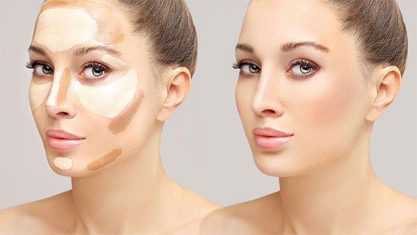 La forma correcta de hacerlo es usando bases cremosas de distintos tonos y esfumando muy bien. La parte más oscura, será aquella que queremos disimular: a los lados de la nariz (para afinarla), sobre los pómulos (para marcarlos) y en el cuello (para disimular la papada). Luego, los puntos de luz, con el tono más claro, deben ser: las ojeras, la línea central de la nariz y debajo de los pómulos.