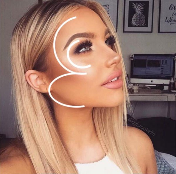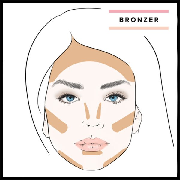 - Existe otra manera de colocar los polvos bronceadores o bronce y consta de dibujar con una brocha en ambos lados del rostro un símbolo en forma de 3, que comenzaría desde el medio de tu frente pasando por la sien hasta llegar a la zona debajo de los pómulos y luego hacia la barbilla. Y para finalizar realiza unos toquecitos en la frente, nariz y barbilla.