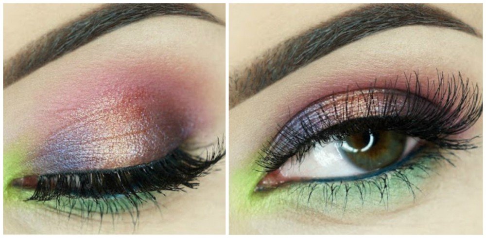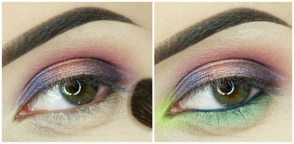 Una vez culmines con el dorado, toma sombra verde manzana y aplica solo un poco de luz en el lagrimal del ojo. Luego con sombra verde hoja, aplica en las pestañas inferiores.