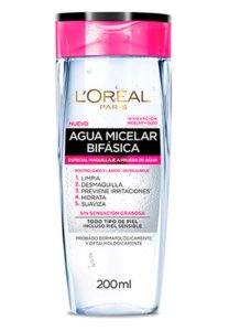 • Si eres de las que usa maquillaje a prueba de agua muy a menudo, te recomiendo la Agua Micelar Desmaquillante Bifásica L’ Oréal Paris, que te limpiara muy bien el rostro.