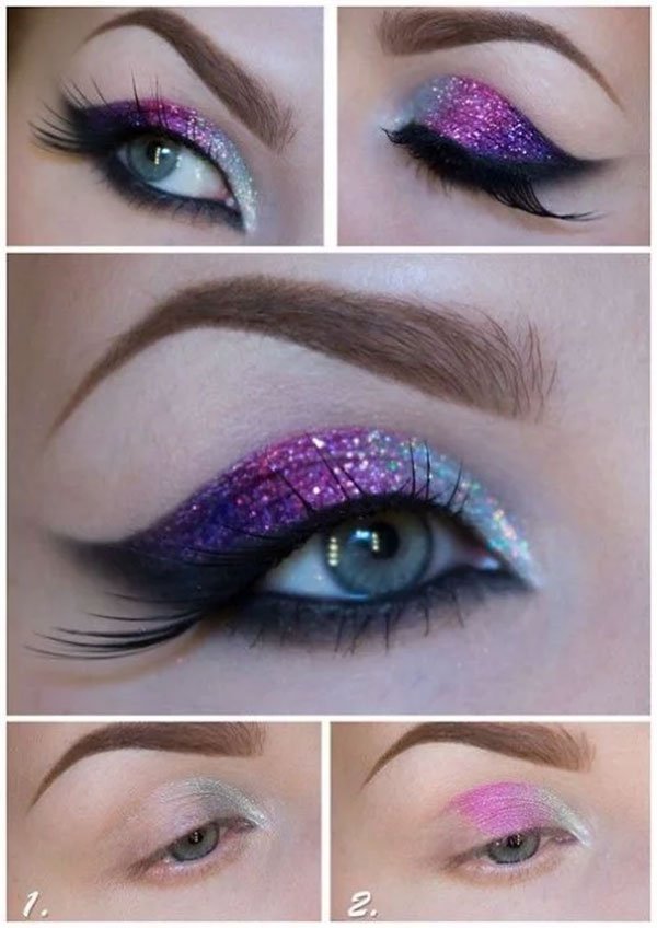 Un maquillaje con morado muy brillante
