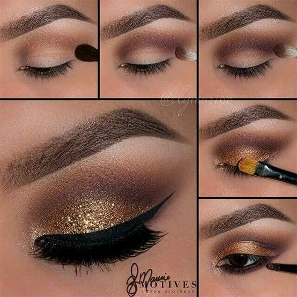 Si vas a utilizar un conjunto que no posee mucho brillo puedes elegir este maquillaje repleto de varios tonos dorados y glitter para darle un poco más de brillo a tu look. Pero si en tu caso es todo lo contrario y tu outfit es muy brillante puedes optar por un maquillaje dorado un poco más discreto para lograr un equilibrio en tu atuendo.