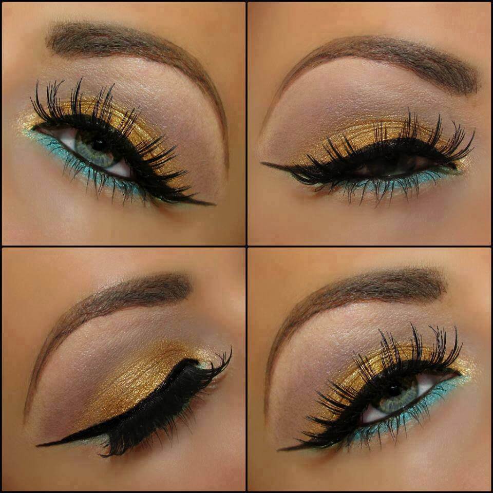 Luego tomamos la sombra en tono dorada y la colocamos en toda la zona del ojo superior, en los parpados y a medida que nos acercamos a las pestañas le pasamos más para que se fije bien. Y a media que te acercas a las cejas le aplicas un poco menos así queda con un efecto de difuminado.