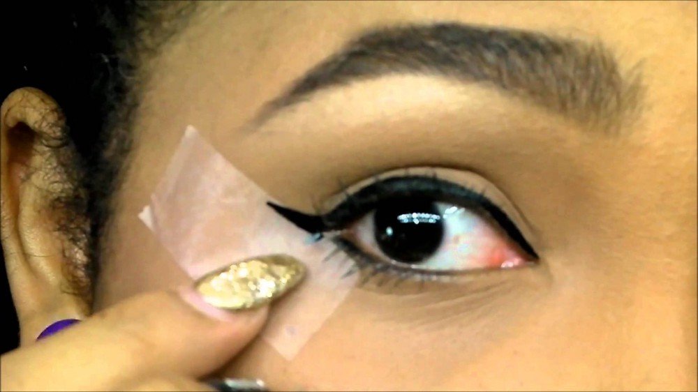 Otra opción es intentar el delineado con objeto que pueda simular una línea recta, como una regla, cuchara o cinta plástica adherible, procede a delinear sobre la base del objeto y luego retíralo, de esta manera se trazara el angulo completamente derecho y quedara un delineado perfecto. Luego remueve los excesos con un hisopo de algodón humedecido con desmaquíllante.